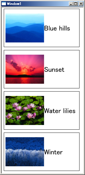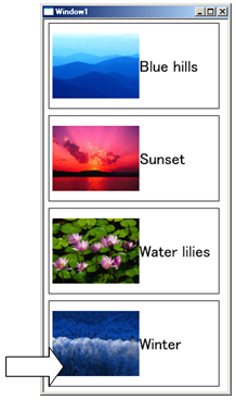 | <Window.Resources> <x:Array x:Key="List" Type="{x:Type sys:String}"> <sys:String>A</sys:String> <sys:String>B</sys:String> <sys:String>C</sys:String> </x:Array> </Window.Resources> <StackPanel?> <ListBox? ItemsSource?="{Binding Source={StaticResource? List}}"/> </StackPanel?> ※ 先頭で、.NET FrameworkのSystem名前空間のインポートが必要 xmlns:sys="clr-namespace:System;assembly=mscorlib" ※ StaticResource?については次項で説明する。 |