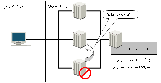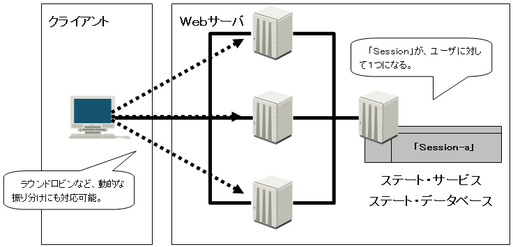 ステート サービス・ステート データベースを利用すると、ネットワーク負荷分散(冗長化)構成を組み「Session」を使用する場合も、同一クライアントからの要求を、特定のノードへ割り当てる必要がなくなる。
