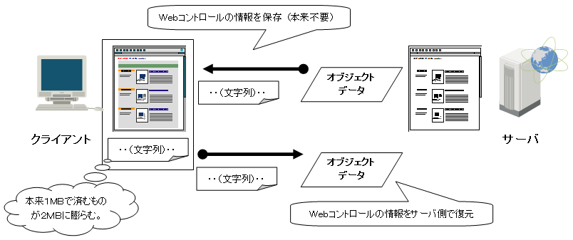 例えば、読み取り専用のグリッド ビュー コントロールに表示データをデータ バインドし、クライアントに出力したとする。すると、ASP.NETの基盤処理により、自動的にデータ グリッド コントロールの表示状態の情報を「ViewState」に出力してしまう。