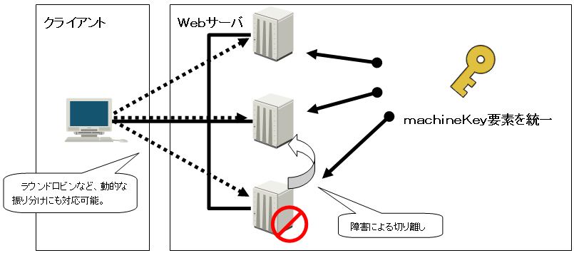 machineKey要素をネットワーク負荷分散(冗長化)の構成ノード全体で統一することにより、クライアントのリクエストが別のノードに振り分けられた場合でも、暗号化された「Session」・「ViewState」・「Cookie認証チケット」を復号化・検証できるようになり、処理を続行できる。