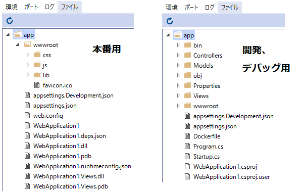 docker run -dt -v "...\vsdbg\vs2017u5:/remote_debugger:rw" -v "...\WebApplication1:/app" -v "...\WebApplication1:/src/" -v ... マウントやら、環境変数やら。