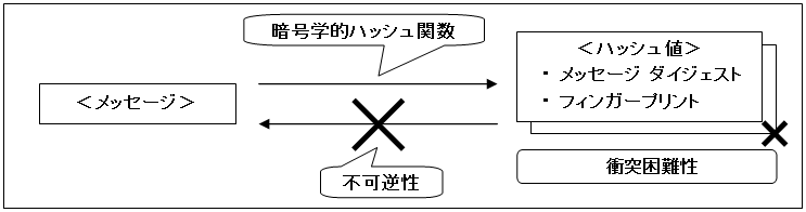 また、「暗号学的ハッシュ関数」には、次のようなことが求められているため、