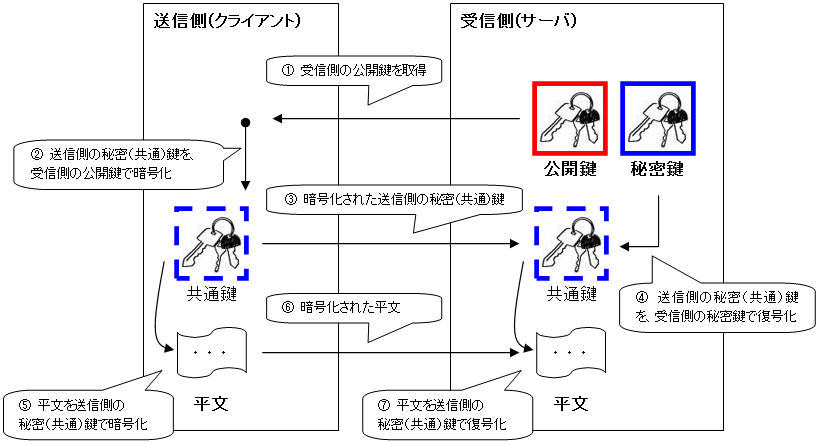 「公開鍵・暗号化方式」で「送信側の秘密(共通)鍵」を共有し、