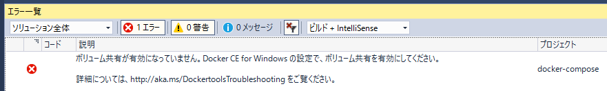 - デバッグのドロップダウン・リストからDockerを選択した状態でデバッグ実行しようとすると、以下のエラー・メッセージが表示されるが、
