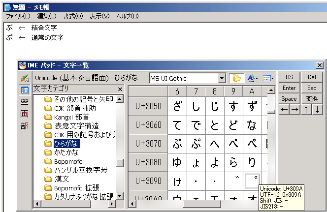 結合文字は、言語バーにある、IMEパッドから、「ふ」+「゚」=「ぷ」と入力することで、入力できる。下記の図は、通常の文字の「ぷ」と、結合文字の「ぷ」を入力したところ。