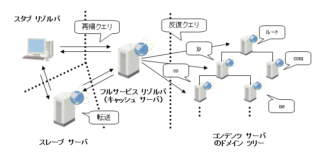 - また、同じ問い合わせを何度も繰り返すという非効率を避けるため、一度名前解決をした情報を内部にキャッシュして再利用することから「キャッシュ サーバ」とも呼ばれる。